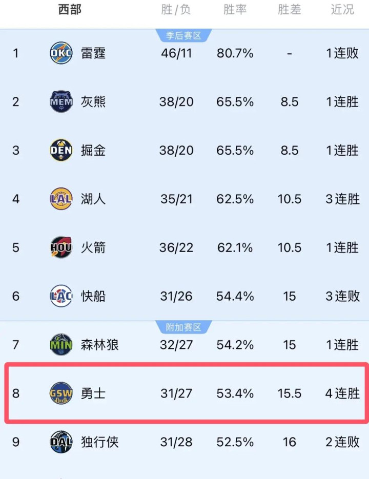 而湖人队的胜利正好送给了独行侠队一个关键失利,勇士队因此成功超越独行侠,进入了西部前八。